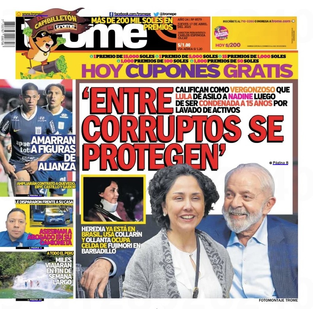 “Entre corruptos, se protegem”, diz a manchete do jornal “Diario Trome” de quinta-feira (17). “Qualificam como vergonhoso que Lula dê asilo a Nadine logo após ser condenada a 15 anos por lavagem de dinheiro”, afirma a capa do periódico.