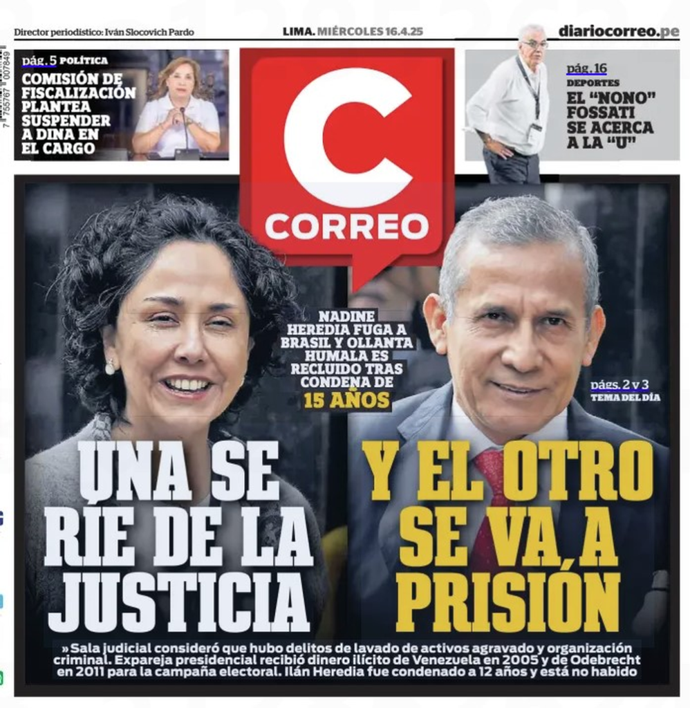 Capa do jornal peruano ‘Correo’ de 16 de abril de 2025 — Foto: Reprodução